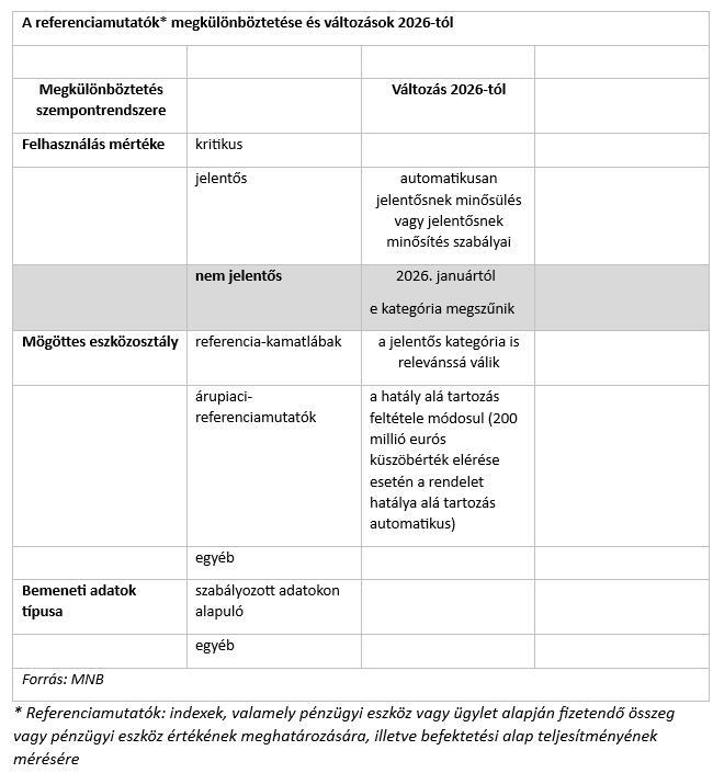 A felülvizsgálat következtében mindez 2026. januártól úgy módosul, hogy a nem jelentős referenciamutatók kikerülnek a rendelet hatálya alól. Ezáltal kevesebb piaci szereplőre lesznek alkalmazandók a szabályok, hiszen azokat csak a kritikus és jelentős referenciamutatók esetében szükséges betartani. Fontos ugyanakkor, hogy az egyes uniós szakpolitikai célkitűzéseket szolgáló referenciamutatók (pl. az uniós éghajlatváltozási, valamint a Párizsi Megállapodáshoz igazodó referenciamutatók) esetében is több szabályt alkalmazni kell (a felhasználásuk mértékétől függetlenül).