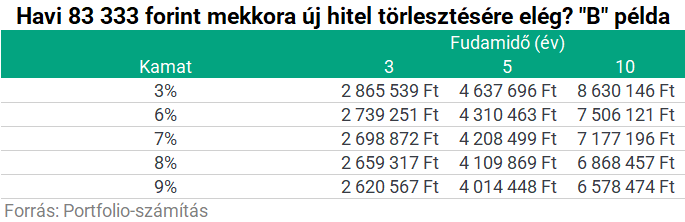 A várható legjellemzőbb felhasználási mód, vagyis a normál havi hiteltörlesztés esetén az érintettek jellemzően tisztában vannak vele, hogy a havi 83 333 forint a havi törlesztési terhük hányad részétől szabadítja meg őket, mindenesetre az alábbi táblázatban összefoglaljuk azt, hogy ekkora havi támogatás mekkora tartozásösszeg, kamat és futamidő mellett elég a teljes hiteltörlesztés fedezésére. A táblázat eredeti hitelösszeggel is értelmezhető teljes futamidő figyelembevételével, illetve aktuális hiteltartozással is, csak ebben az esetben a hátralévő futamidőkét ételmezve a feltüntetettet. Számításunk során azt kaptuk, hogy ez a havi támogatási összeg