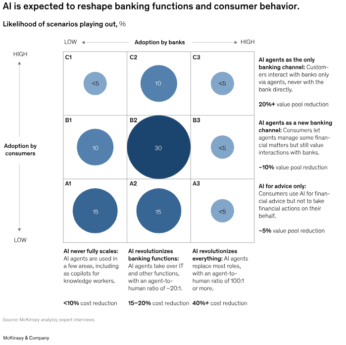 Más kimenetek kevésbé valószínűek. Az egyik forgatókönyv például azt feltételezi, hogy a fogyasztók teljes egészében MI-ügynökökre bízzák pénzügyi döntéseiket, miközben a bankok drasztikusan csökkentik a létszámot. Ehhez két, középtávon valószínűtlen feltételnek kellene teljesülnie: a szabályozók engedélyeznék, hogy ügynökök önállóan hajtsanak végre tranzakciókat az ügyfelek nevében, másrészt az AI képes lenne maradéktalanul reprodukálni a felsővezetői szintű döntéshozatalt. Ugyanakkor még akkor is súlyos iparági zavarokat okozhatna ez a modell, ha az AI-ügynökök nem lennének teljesen autonómak, és az ügyfeleknek jóvá kellene hagyniuk az általuk előkészített tranzakciókat.