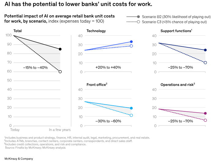 Például az AI széles körű bevezetése a bankrendszerben egyes költségkategóriákban akár 70 százalékos bruttó csökkenést is hozhat. Mivel ezt részben ellensúlyozzák a növekvő technológiai kiadások, a teljes költségbázisra gyakorolt nettó hatást 15–20 százalékos mérséklődésre becsli a McKinsey. Ezek a megtakarítások azonban várhatóan nem maradnak tartósan a bankoknál. Ahogy korábbi innovációknál is láttuk, a verseny idővel leapasztja a banki előnyöket, és a haszon nagyobb része az ügyfelekhez kerül.