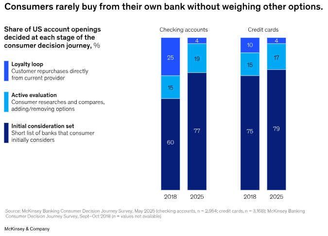 Új típusú szereplők – aggregátorok, generatív MI-platformok, közvetítők és beágyazott pénzügyi szolgáltatók – tovább bonyolítják a fogyasztói döntési utat, és felgyorsítják a lojalitás általánosan megfiygelhető csökkenését.