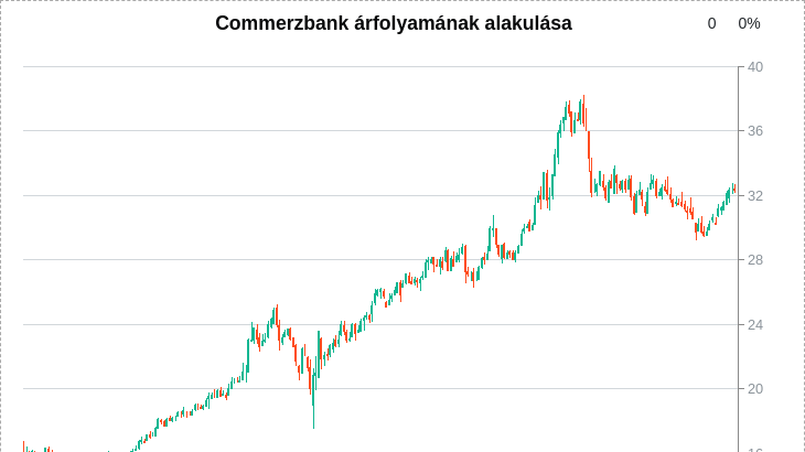 A német Commerzbank csütörtökön közölte, hogy a szeptember 30-án zárult negyedévben 591 millió euró nettó nyereséget ért el, szemben az egy évvel korábbi 642 millióval. Az elemzői konszenzus 659 millió eurót várt. A gyengébb eredményt a Reuters szerint a magasabb effektív adókulcs és a költségek növekedése magyarázza, ugyanis a társaság effektív adókulcsa 36%-ra emelkedett a tavalyi 22%-ról.