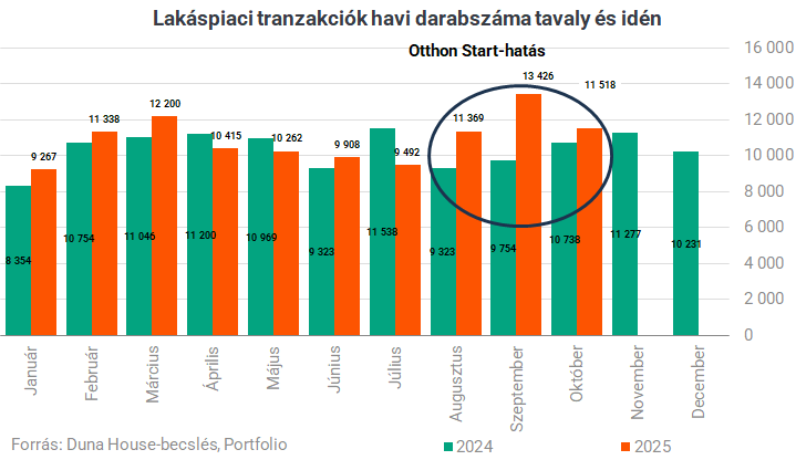 A Duna House keresletindexe alapján januártól júniusig fokozatos csökkenés volt megfigyelhető (98 → 65), majd júliusban enyhe emelkedés (77), amit augusztusban egy kiugró érték követett (110). Ez a keresleti csúcs egyértelműen az OSP hatásának tulajdonítható. Szeptemberben és októberben már visszarendeződés történt (87 → 73), ami a piaci normalizálódás jele. Az ingatlanközvetítő szerint nyáron még a hirtelen megnövekedett érdeklődések mögött sok esetben nem valódi vásárlási szándék állt, de