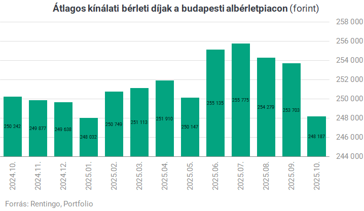 Októberben a lélektani 250 ezer forint alá süllyedtek Budapesten az átlagos kínálati bérleti díjak, amire utoljára januárban volt példa – derült ki a Rentingo legutóbbi albérletpiaci elemzéséből. Az egy évvel korábbihoz képest nominálisan is olcsóbban lehet most albérlethez jutni Budapesten, miután 248 ezer forintra estek az átlagos kínálati bérleti díjak. A keresleti árak az augusztusi mélypont után stabilizálódtak: a bérlők átlagosan 219 ezer forintért kerestek kiadó lakást, így az augusztusi 20 százalékos rekord árolló 13 százalékra mérséklődött októberre. A bérbeadási platform szerint az árcsökkenés nem egyenletes: