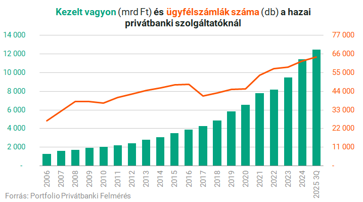 a privátbanki szolgáltatóknál kezelt vagyon megközelítette a 12,5 ezermilliárd forintot, amely egy negyedév alatt 2,5%-os, egy év alatt pedig több mint 14%-os növekedést jelent.