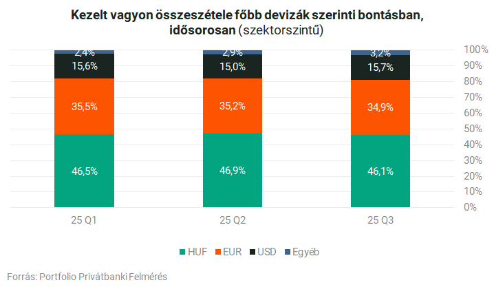 a kezelt vagyon 46%-át tartják a gazdagok forintban, vagyis a vagyonuk nagyobb része devizákban van. Ezek között kiemelkednek az eurós vagyonelemek 35%-kal, valamint a dollár 16%-kal.
