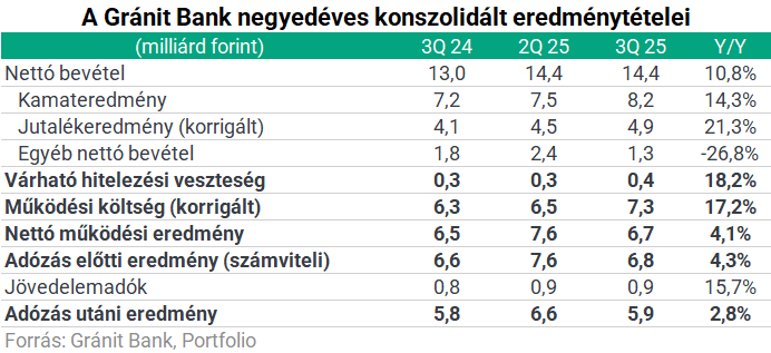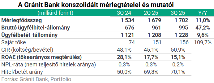 A Gránit Bank egyedi szinten 2025 szeptember végén 16,1 milliárd forint adózás előtti, illetve 14,5 milliárd forint adózás utáni eredményt ért el, amely a bank eddigi történetének legmagasabb három negyedéves profitja.