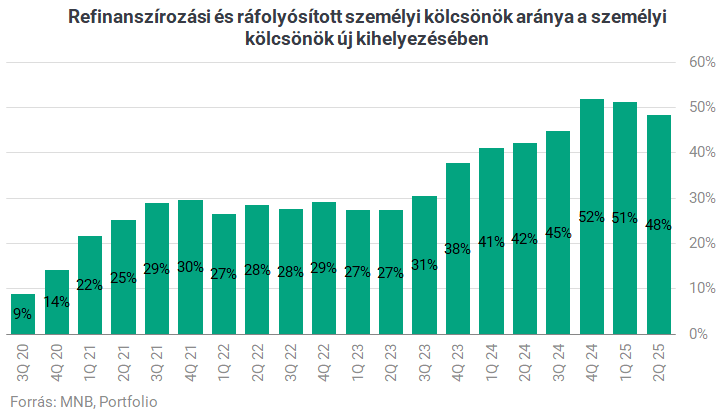 Az MNB legutóbbi Pénzügyi stabilitási jelentése szerint idén az első félévben már 50% környékén járt a refinanszírozási jellegű hitelfelvétel aránya a magyar személyi kölcsönök piacán, ide értve a ráfolyósított (top-up) hiteleket is. Utóbbinál egy magasabb összegű, de alacsonyabb kamatozású tartozás biztosítja sok esetben az akár változatlan törlesztőrészletet az ügyfél számára.