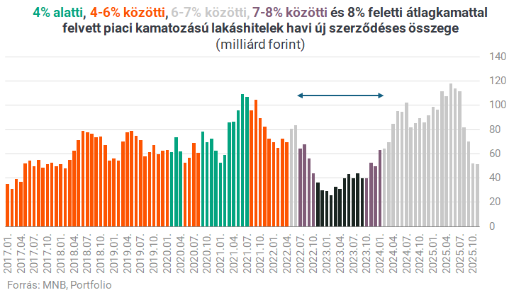 A ma állampapír-befektetéssel elérhető 7%-os hozamnál magasabb kamatok mellett jellemzően 2022 és 2024 között vettek fel lakáshitelt a magyar háztartások: