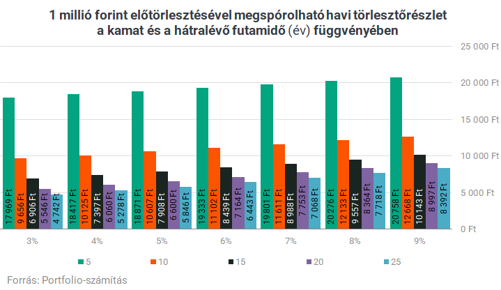 - Havi szinten egy 9%-os kamatozású, 25 éves hátralévő futamidejű hitel esetén az előtörlesztés akár havi 7200 forinttal is csökkentheti a kiadásokat. (Az előtörlesztés egyszeri, kb. 10-20 ezer forintos díját ezzel érdemes szembeállítani.)