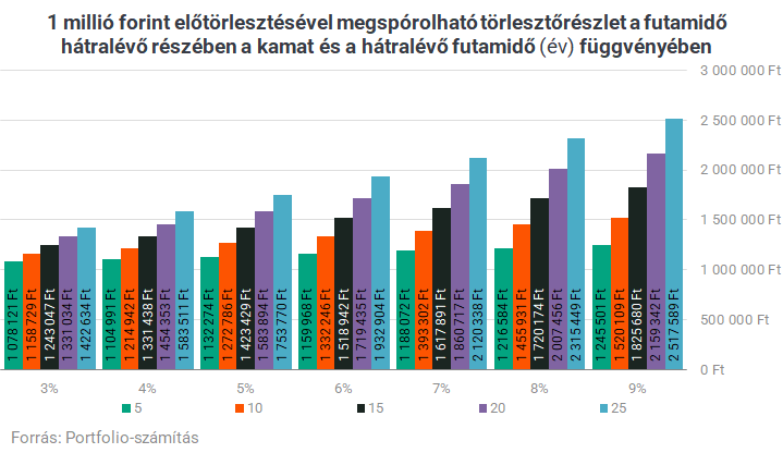 - A futamidő végéig ugyanezen feltételek mellett a teljes megtakarítás elérheti a 2,5 millió forintot, hiszen ennyivel kevesebb kamatot kell kifizetni a banknak.