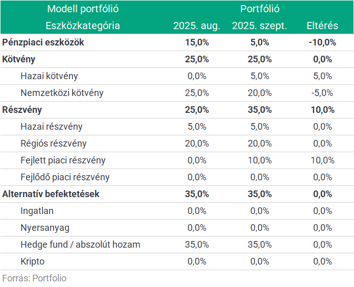 A nyári oldalazás folytatódott szeptemberben is, a szezonálisan gyenge piacon az Egyesült Államok részvénypiacai tudtak csak tovább emelkedni részben a mesterséges intelligenciát övező hírözönben, de még inkább a továbbra is gyengélkedő dollár hatására. A 2025 első felében látott európai felülteljesítés az április vámbejelentés óta nézve már inkább hasonlóan alakul az amerikaival közös devizán nézve, így a november elején várt német költségvetés és a rövidtávú alulpozicionáltság miatt taktikailag megemeltük ajánlott részvénykitettségünket olyan papírokban, amelyek kitettek a német stimulusra és az európai gazdaság „újraindulására”. Ugyan a gyengülő dollár továbbra is ellenszél lehet ebben a tekintetben, továbbra is úgy gondoljuk, hogy fordulópont előtt áll Európa és ezzel együtt a régiónk.