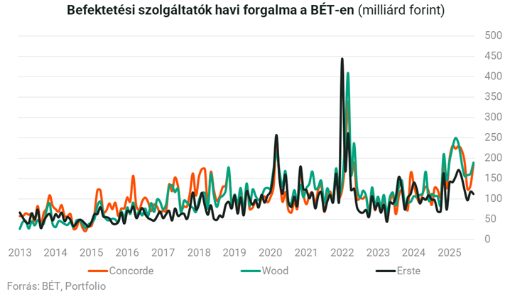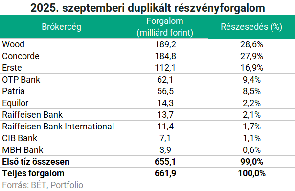 A befektetési szolgáltatók rangsorában szeptemberben a Wood végzett az élen 189,2 milliárd forintos forgalommal. A második helyet a Concorde szerezte meg 184,8 milliárd forinttal, míg a dobogó harmadik fokán az Erste zárt 112,1 milliárd forintos forgalommal.