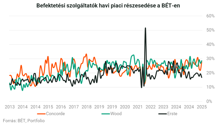 A Wood így a forgalom 28,6 százalékát, a Concorde 27,9 százalékát, az Erste pedig 16,9 százalékát bonyolította.
