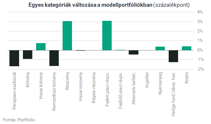 több mint 3 százalékponttal nőtt a súlyuk a közös modellportfólióban, miközben a hazai, régiós és fejlődő piaci részvények súlya hangyányit sem változott.