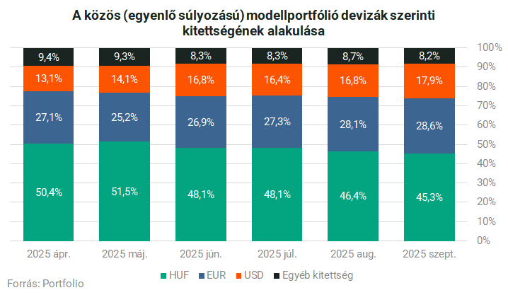 A sorozatban az egyes alapkezelők devizák szerinti súlyozását is figyelemmel kísérjük. A szeptember végi pillanatkép szerint