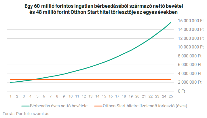 Igen, kitermeli, de alacsony önerő esetén még nem azonnal, csak az első néhány év után, hiszen míg a törlesztőrészlet fix, a bérleti díj emelhető. A lakásérték arányában nettó 3,4%-os bérbeadásból származó bevételt feltételezve például egy 60 milliós lakás az első évben havi 170 ezer forint költségekkel csökkentett bevételt termelhet, ezzel szemben 228 ezer forint törlesztőrészletet kell fizetni, ha a lakásérték 80%-a, 48 millió a felvett hitelösszeg. Feltételezve azonban, hogy a bérleti díj a lakás értékével együtt emelkedik, évi 9%-os értéknövekedés esetén az 5. évtől már magasabb lesz a bevétel, mint a hitel törlesztőrészlete. A projekt „önfinanszírozóvá” válik.