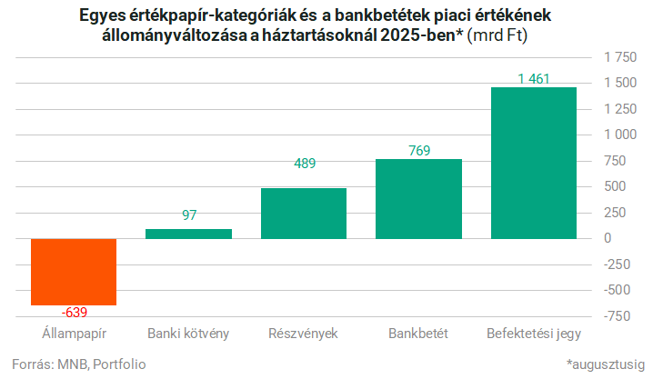 Összegszerűen a második legnagyobb idei növekedést a bankbetétek tudhatják magukénak, év eleje óta 769 milliárd forintos emelkedéssel, augusztusban 81 milliárd forinttal gyarapodtak a háztartások bankbetétei. A részvények állománya idén több mint 489 milliárd forinttal nőtt, ebből a tranzakciók hatása gyakorlatilag nulla, a növekedés egészéért az átértékelődés (hozam) volt felelős.