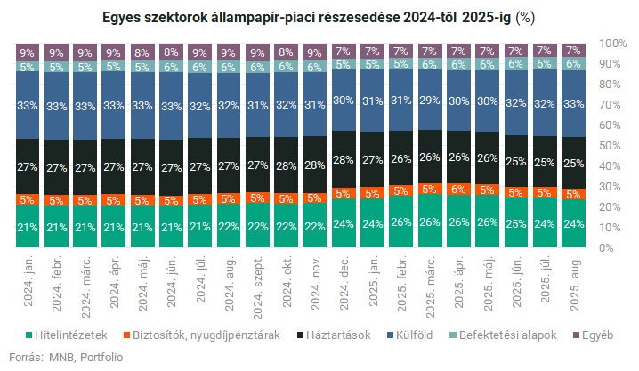 A háztartások augusztus végén 25,0%-os részt képviseltek az államadósság finanszírozásában, ez az év eleji 28,0%-hoz képest számottevő csökkenést jelez. A bankok részesedése a teljes államadósságon belül augusztus végén 23,9% volt, ami kis csökkenést jelez a december végi 24,1%-hoz képest. A külföldiek részesedése – a rendkívül jelentős nyári devizakötvény-kibocsátás hatására is – idén számottevően növekedett, augusztus végén már 32,9%-ot tett ki, ez másfél éves csúcs.