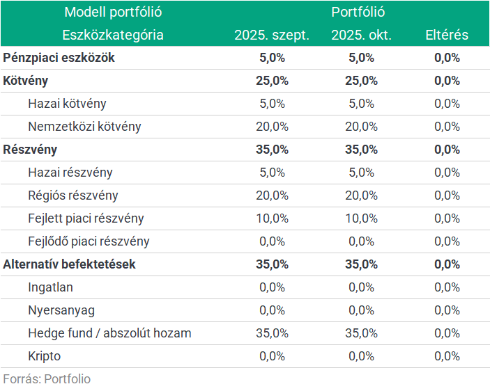 Az amerikai kormányzati leállás hónapfordulóján relatíve eseménytelen hetekre tekinthetünk vissza. Az egyetlen újdonság az említett ok miatti ritkább adatközlés volt, mivel Trump sokadik békehírére sem látszik változás a háborús frontokon – talán ezért sem ő kapta végül a Nobel-békedíjat –, a mesterséges intelligencia hypeja tovább pörög, így az amerikai piac lassan ledolgozza a DAX-szal szembeni idei lemaradását, na persze nem közös devizában mérve. Az amerikai cégek jelentései egyelőre vegyesen alakultak és láthatóan fennmarad az elmúlt évek erősödő tendenciája, hogy szélsőséges piaci reakciók követik ezeket a várakozásokhoz mért eredmények fényében. Szeptemberben megemelt európai részvénykitettségünket továbbra is tartjuk, a régió idei kimagasló teljesítménye fennmaradhat, miközben novemberben már érkezhetnek hírek a német költségvetéssel kapcsolatban, amik új lökést adhatnak az év elején nagyot emelkedő piacnak.