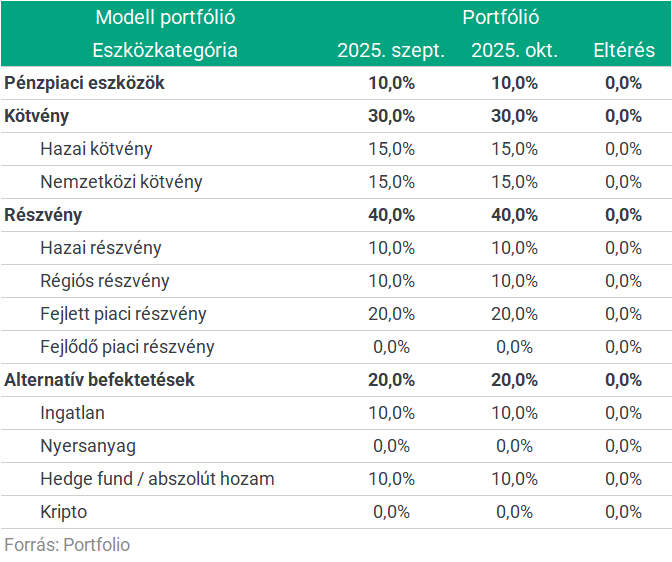 A modell portfólió arányait nem változtattuk jelentősen. A kötvény eszközosztályon belül a hazai kötvényarány változatlan, mivel a relatív alulértékeltség fennmaradt és a várható régiós kamatcsökkentések hatására az MNB mozgástere fokozatosan növekszik. A részvény eszközosztályon belül továbbra is bízunk a hazai és régiós részvények felülteljesítésében. A fejlett piaci részvények súlyát 20%-on tartottuk."