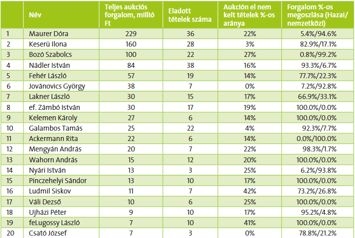 Az adatbázisunk alapján azonosítható az a Top 20 élő és 20 nem élő művész, akiknek jó a likviditása, több művük szerepel árveréseken, és teljesítményük nyomon követhető.
