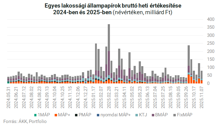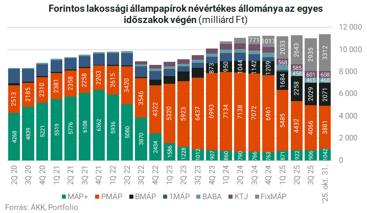 Idén már összesen 4638 milliárd forintnál jár a forintos lakossági állampapírok bruttó értékesítése. Ebből 2354 milliárd forintért a FixMÁP felelt, 1167 milliárdot a BMÁP vonzott be, a harmadik helyen álló MÁP Pluszt pedig 547 milliárd forintért vették idén a befektetők.