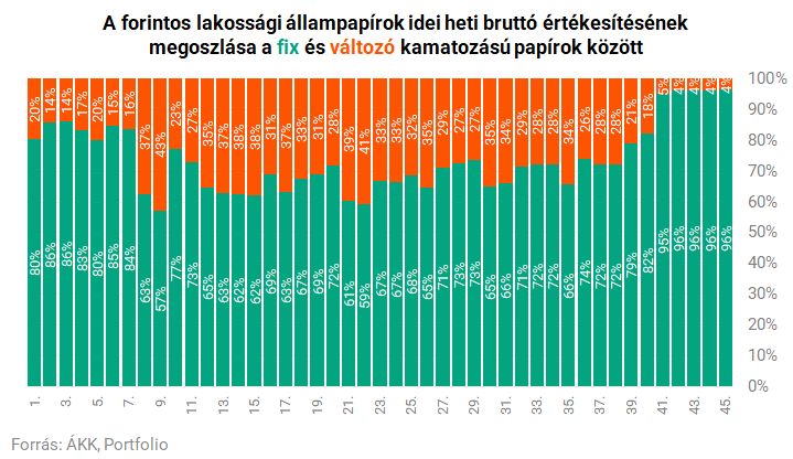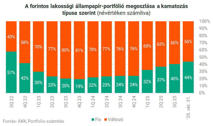Ezzel párhuzamosan fokozatosan szorulnak vissza a változó kamatozású papírok (Babakötvény, PMÁP, BMÁP), az év első tíz hónapjában – főként a Prémium Magyar Állampapírokból kiáramló ezermilliárdok okán – 76%-ról 56%-ra mérséklődött a változó kamatozású papírok súlya.