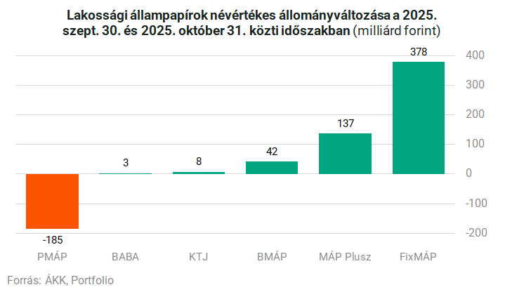 A kötvények sorából kilóg a Prémium Magyar Állampapír, amelyik októberben egyedüliként nem növelte az állományát a forintos lakossági kötvények közül. Észrevehető, hogy a PMÁP-ból kiáramló pénzek (185 milliárd forint) és a FixMÁP kivételével a többi papír beáramlásai hozzávetőlegesen kioltják egymást, így a FixMÁP-on kívüli lakossági állampapír-portfólió (Babakötvény, BMÁP, PMÁP, KTJ és MÁP Plusz együttvéve) valójában nem igazán növekedett, csupán átrendeződött.