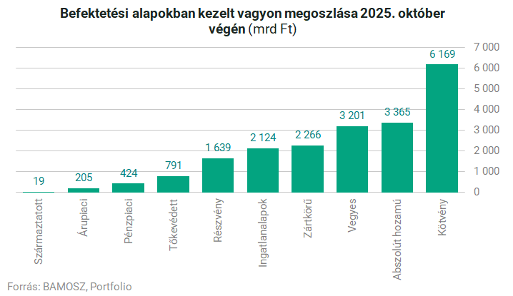 Az október végi állapot szerint a kötvényalapok a legnépszerűbbek, itt közel 6200 milliárd forintot tartanak a befektetők, a második és harmadik helyet az abszolút hozamú (3365 milliárd) és a vegyes (3201 milliárd) alapok szerezték meg, míg a részvényalapok 1639 milliárd forintnyi állományt tudtak felmutatni október végén.