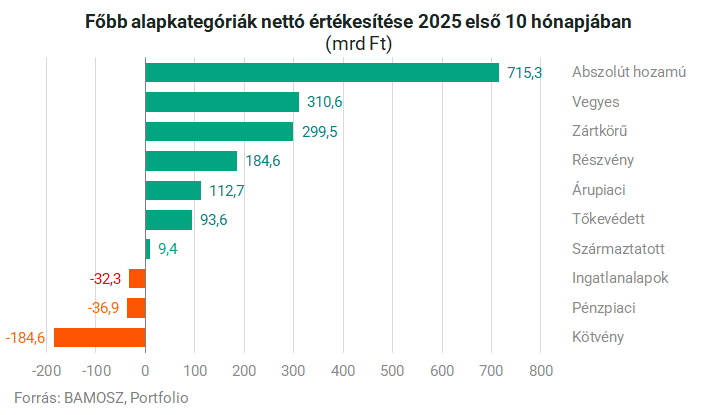 a tőkebeáramlás közel felét az abszolút hozamú alapok "tették zsebre", míg a vegyes és a zártkörű alapok hozzávetőleg 300-300 milliárd forintnyi nettó értékesítést produkáltak. A részvényalapok a negyedik helyet szerezték meg 185 milliárdos nettó beáramlással, az év veszteseinek pedig a kötvényalapok tekinthetők, innen tíz hónap alatt nettó értelemben 185 milliárd forint távozott.