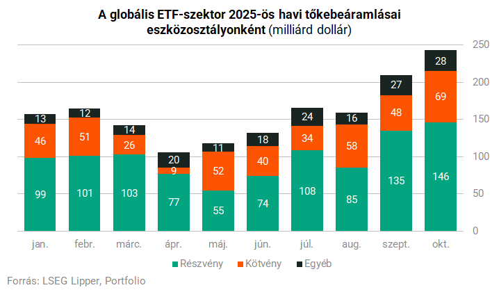 A tizedik hónappal együtt a szektor teljes idei tőkebeáramlása nettó 1598 milliárd dollár fölé emelkedett, ebből 982 milliárd dollárt a részvény-, 433 milliárdot a kötvény-, 183 milliárdot az egyéb ETF-ek tudhatnak magukénak.