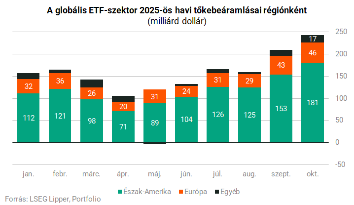 Múlt hónapban rendkívül nagy összeget, nettó értelemben (azaz a pozitív és negatív pénzmozgásokat egymással szembeállítva) 243 milliárd dollárnyi friss tőkét vonzottak a globális ETF-ek; ez az ugyancsak csúcsot érő szeptemberi értéket további 16%-kal fejelte meg – derül ki az LSEG Lipper legfrissebb adatközléséből. Összehasonlításképpen, a 2025 legnagyobb tőzsdei megrázkódtatását hozó áprilisi hónapban alig 100 milliárd dollár volt az ETF-ek globális nettó értékesítése.