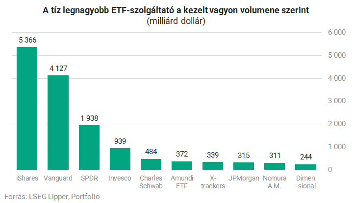 A legfrissebb adatokból az is kiderül, hogy a globálisan tíz legnagyobbnak tekinthető ETF-szolgáltató együttesen több mint 14 400 milliárd dollárnyi befektetést kezel, így közel 80%-os részesedéssel bír az ETF-szektorban. Az első három helyezett a kezelt vagyon nagysága szerint a BlackRockhoz tartozó iShares, a Vanguard, valamint a State Street Global Advisors (SSGA) által kínált ETF-család, az SPDR. A hónap legjobb értékesítője a Vanguard volt (+56 milliárd dollár), megelőzve az iShares-t (+47 milliárd dollár) és az SPDR-t (+25 milliárd dollár).