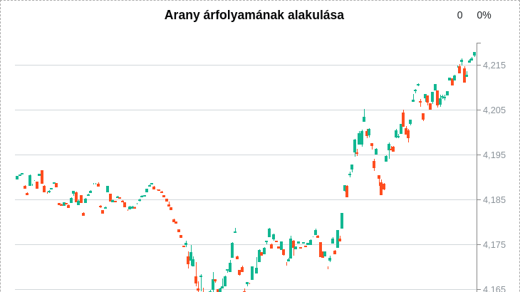 Pénteken az arany ára kéthetes csúcsra emelkedett, amit a Fed kamatcsökkentési reményei támogattak - az azonnali ár 0,45 százalékkal 4175,50 dollárra nőtt, mostanra pedig már 4215 dollár fölé emelkedett.