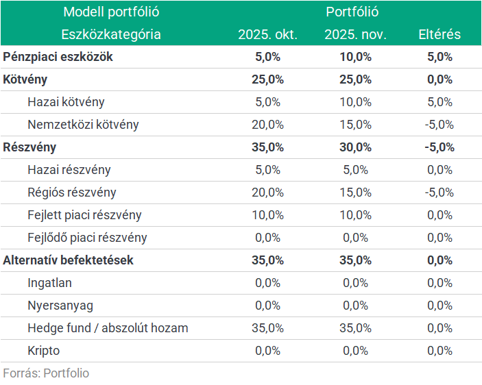 A szezonálisan legerősebb hónapnak számító november nem váltotta be a hozzá fűzött reményeket, a mesterséges intelligencia papírok kisebb-nagyobb korrekciója a hónap közepén inkább kockázatkerülést hozott. Ezzel szemben a régiós papírok tovább meneteltek, továbbra is abszolút csúcs körül kereskedve, így itt jobbnak látjuk a kitettség csökkentését, kifejezetten az orosz-ukrán háború proxijaként viselkedő papírok esetében. Bár a kormányzati leállás problémája megoldódott, a kimaradó adatok miatt relatíve vakrepülésben hoz döntést a Fed december elején, így innen is eredhet kockázat, ami szintén alátámasztja az óvatosságunkat. Fejlett piaci kitettségünket, amely alatt teljes egészében Nyugat-Európát értjük, továbbra is tartjuk, egyáltalán nem látszik olyan szélsőségesnek a pozicionáltság, mint egyes régiós részvények esetében.