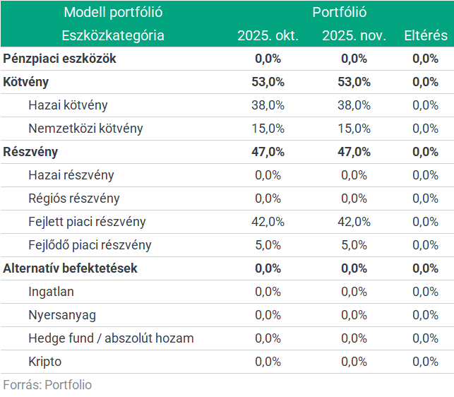 "Novemberben az elmúlt hónapokhoz képest jelentősen megnőtt a volatilitás a tőzsdéken. A befektetők egy része elbizonytalanodott az AI-sztori értékeltségével, finanszírozhatóságával és megtérülésével kapcsolatban, így megindult némi korrekció a technológiai szektorban, míg az elmúlt időszakban hanyagolt defenzív szegmenseket ismét kezdték felfedezni a piacok. Emellett a Fed kamatvágásával kapcsolatos várakozások mozgatták leginkább az árfolyamokat, az amerikai jegybanknak óvatosan kell manővereznie a még mindig a célérték feletti infláció és a romló munkaerő-piaci folyamatok közepette. A hónap végére azonban ismét az optimizmus vette át a főszerepet, mivel az amerikai gazdaság összességében továbbra is jól tartja magát, a harmadik negyedéves vállalati eredmények a várakozások felett alakultak és a Fed kamatvágásával kapcsolatos várakozások újra erősödtek. Ezzel együtt továbbra is igaz, hogy az amerikai piac drágának számít a várható profitokhoz képest, így bármilyen érdemleges negatív hírre érzékenyebben reagálhatnak a tőzsdék. Az amerikai kötvénypiacon novemberben is csak kisebb mozgásokat láttunk, a hónap végén a 10 éves amerikai államkötvény-hozamok 4% körül alakultak. A hazai kötvénypiacon volt némi hozamemelkedés a hónap során, november végén 7% körül állt a 10 éves magyar államkötvények hozama.
