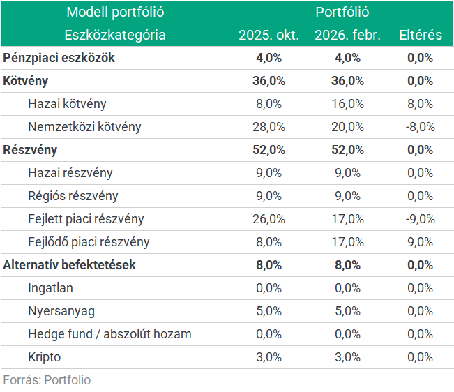 "A piacokat aktuálisan leginkább érintő események – az Iránnal kapcsolatos geopolitikai aggodalmak, a Trump adminisztráció vámrendeleteinek egy részét megsemmisítő Legfelsőbb Bírósági döntés, vagy a mesterséges intelligencia okozta gazdasági átrendeződésből fakadó félelmek – eredményeznek ugyan negatív reakciókat, de megítélésünk szerint az összkép továbbra sem változott, és inkább pozitív. Tartjuk magunkat ahhoz az alapforgatókönyvhöz, ami globálisan viszonylag egészséges gazdasági növekedéssel és dezinflációval számol, amihez erős hátszelet biztosítanak a fiskális és monetáris politikák. A főbb eszközosztályok súlyaihoz ezért nem nyúlunk, a kockázatosabb, részvénytúlsúlyos portfóliót megtartjuk.