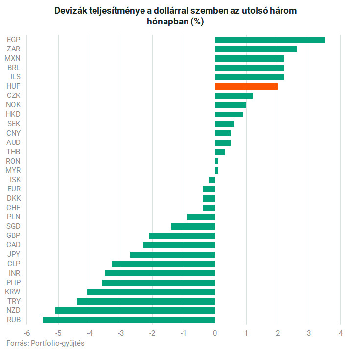 A magyar devizánál nagyobb erősödést csak az egyiptomi, a dél-afrikai, a mexikói, a brazil és az izraeli fizetőeszközök tudtak felmutatni ebben a három hónapban, vagyis akár azt is mondhatnánk, hogy a forint Európa-bajnok volt. Egy valami közös a fenti fizetőeszközökben: mind kifejezetten carry-devizák, ami ismét arra világít rá, hogy a nyáron is a kamatkülönbözetek mozgatták a piacot. Néhány hete egyébként a forint ezen a listán még az első helyen állt, de aztán a dollár múlt heti erősödése kicsit átrendezte a rangsort.