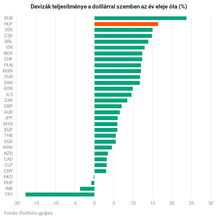 Ha az év eleje óta nézzük, akkor még látványosabb a forint ereje, hiszen 16,5%-kal értékelődött fel a dollárral szemben, aminél