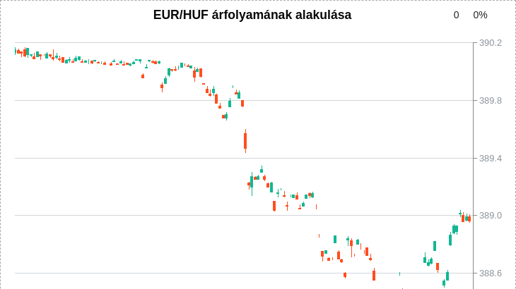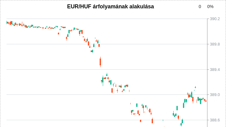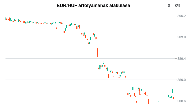 A 389-es szintet is átvitte a forint az euróval szemben, az árfolyam pedig mostanra egészen 388,8-ig csökkent.