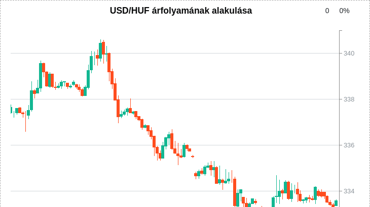 A dollár árfolyama 334 felett jár, miközben korábban 333,2-is erősödött a forint.