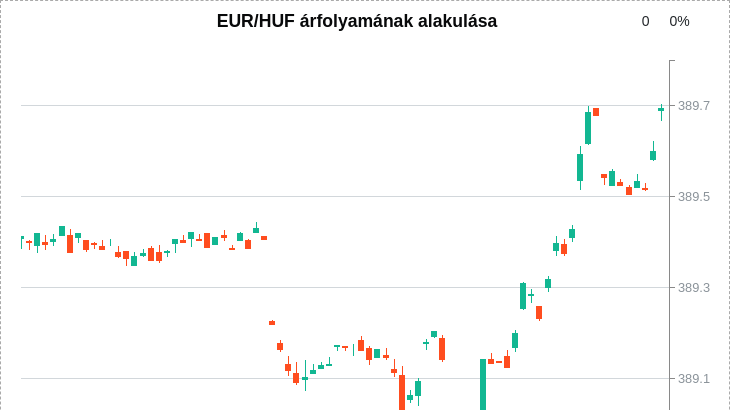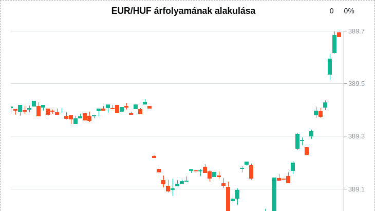 Bár késő délután kezdett erősödni a forint az euróval szemben, estére elfogyott a lendület: az árfolyam a napi csúcsot jelentő 388,35 közeléből már 389 fölé jött vissza.