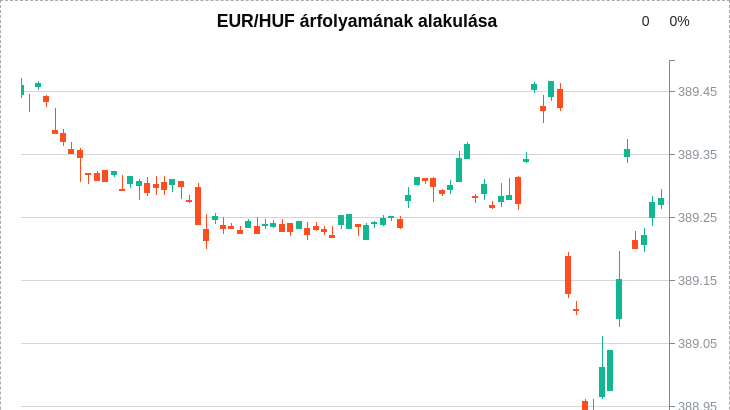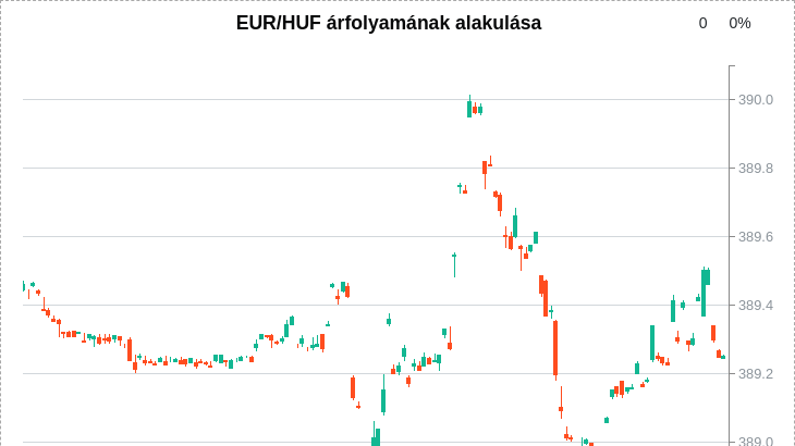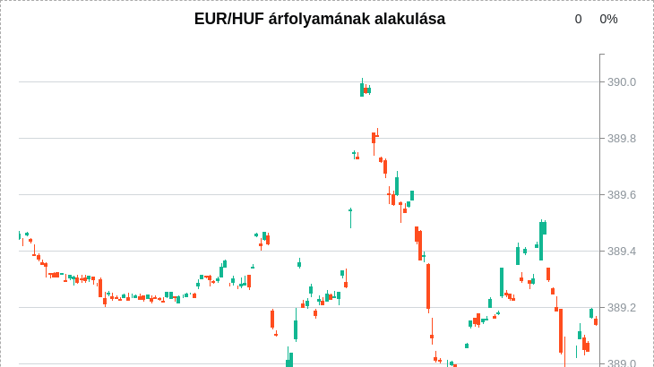 A 389,5 forintos eddigi maximum és a 389,1-es minimum jelzi, hogy a kereskedés egyelőre szűk sávban zajlik.