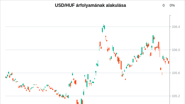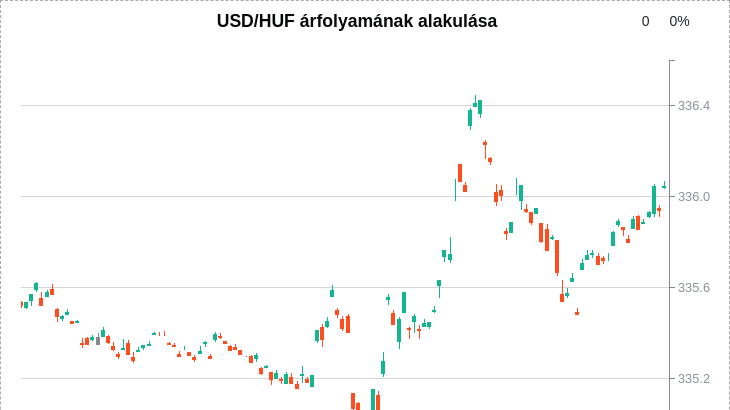 A dollár esetében kicsit intenzívebb elmozdulás látszik, itt az árfolyam már 336 felett van, ami 0,2 százalékos gyengülést jelent.