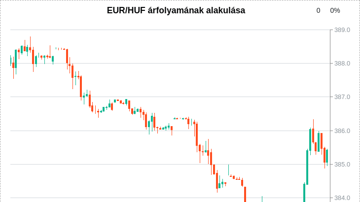 Bár az esti órákra némileg visszaerősödött a forint a napi mélypontokról, napon belül így is 0,3 százalékos gyengülésről beszélünk az euróval szemben, jelenleg 384,9-nél jár a jegyzés. A dollárral szemben kisebb elmozdulás látszik csak, 332,1-nél van a kurzus.