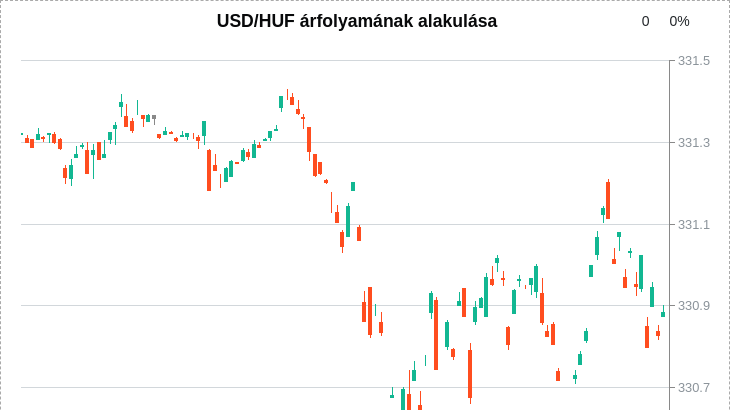 A dollár 0,7 egységet (0,2 százalékot) erősödött a forinttal szemben, ez 331,6 körüli árfolyamot jelent.