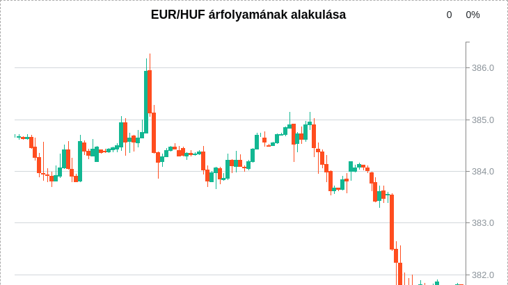 A forint továbbra sem tudja hozni az elmúlt napokban látott erős formáját az euróval szemben, óvatosan gyengül tovább, már 382,5 környékén mozog az árfolyam.