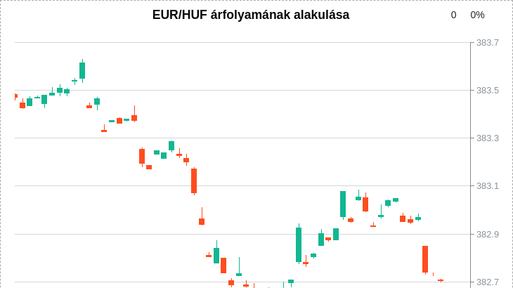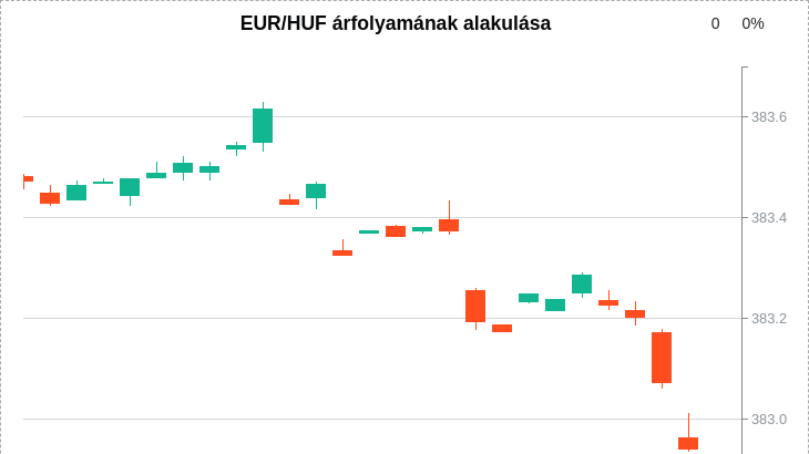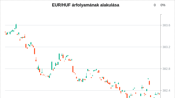 Hétfő reggel 383,4 körül járt a forint az euróval szemben, ez 0,1 százalékos erősödést jelentett péntek estéhez képest a magyar deviza szempontjából. Pénteken 385 felett is járt az árfolyam miután az MNB bejelentette, hogy