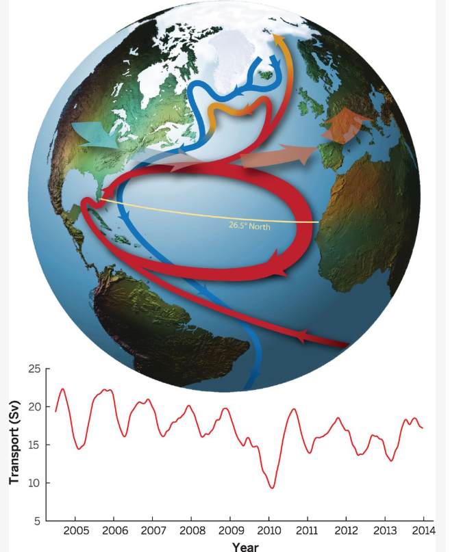 Ez különösen világos, ha az AMOC révén lezajló 17–18 Sv-os (Sv=Sverdrup, 106 m3/s) víz- és ~1,3 PW-ot (petawatt, 1015 W) kitevő hőtranszportra gondolunk. Összehasonlítva, a Föld legnagyobb folyója, az Amazonas által szállított víz mennyisége 0,2 Sv.